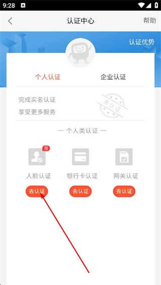 3、在认证中心的个人认证板块下,选择人脸认证并点击去认证。