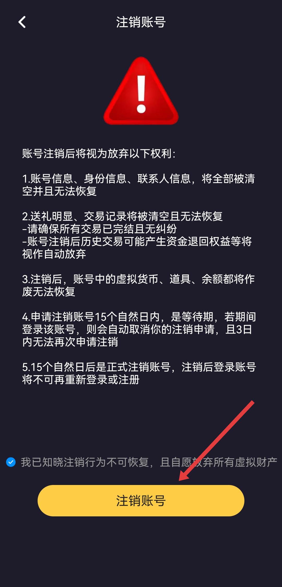 4、在注销账号页面,勾选我已知晓....后,点击注销账号按钮,完成账号注销操作。