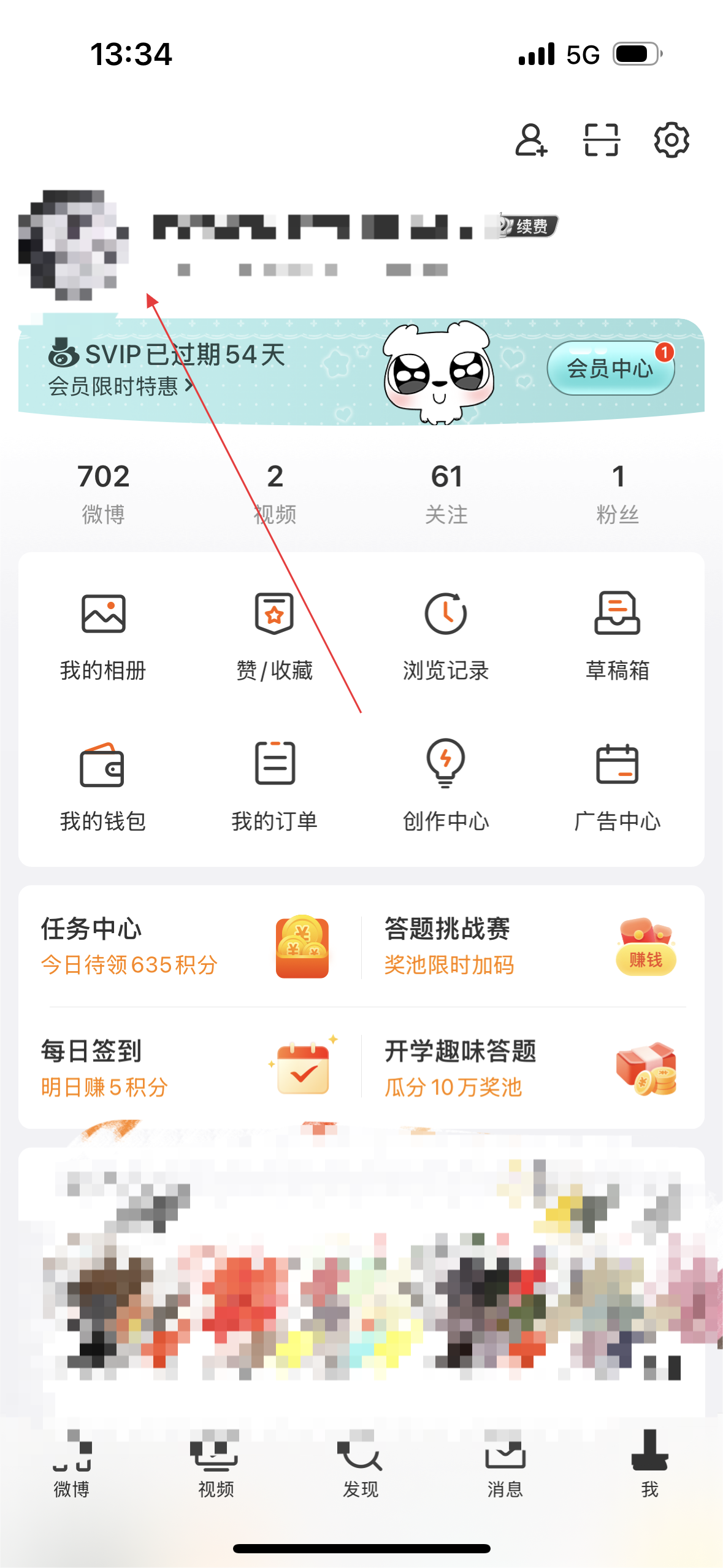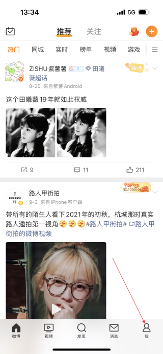 1、在微博首页,点击右下角我,进入个人页面。
