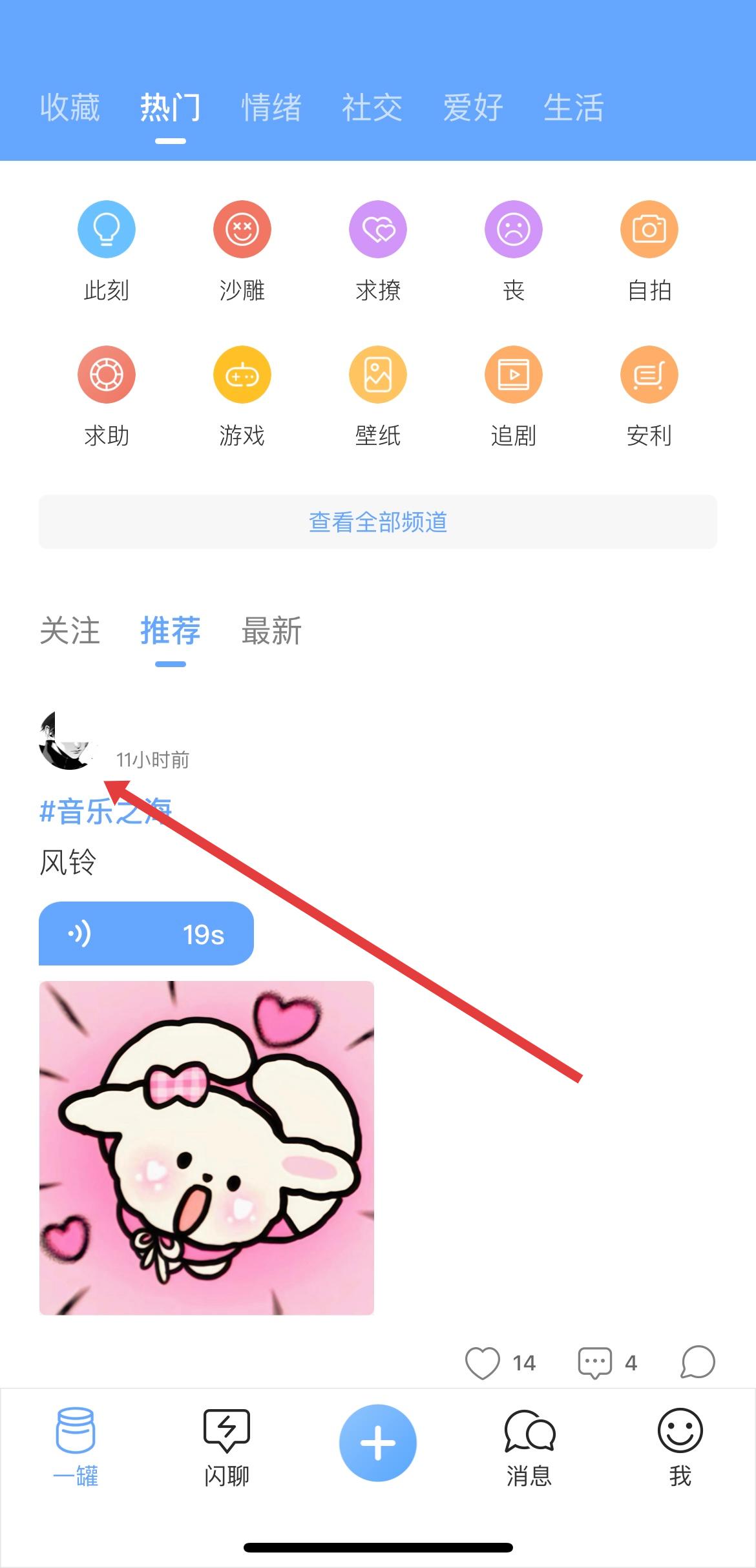 1、打开一罐APP进入主界面,在热门或其他频道,找到想关注用户发布的内容,点击其头像或昵称。