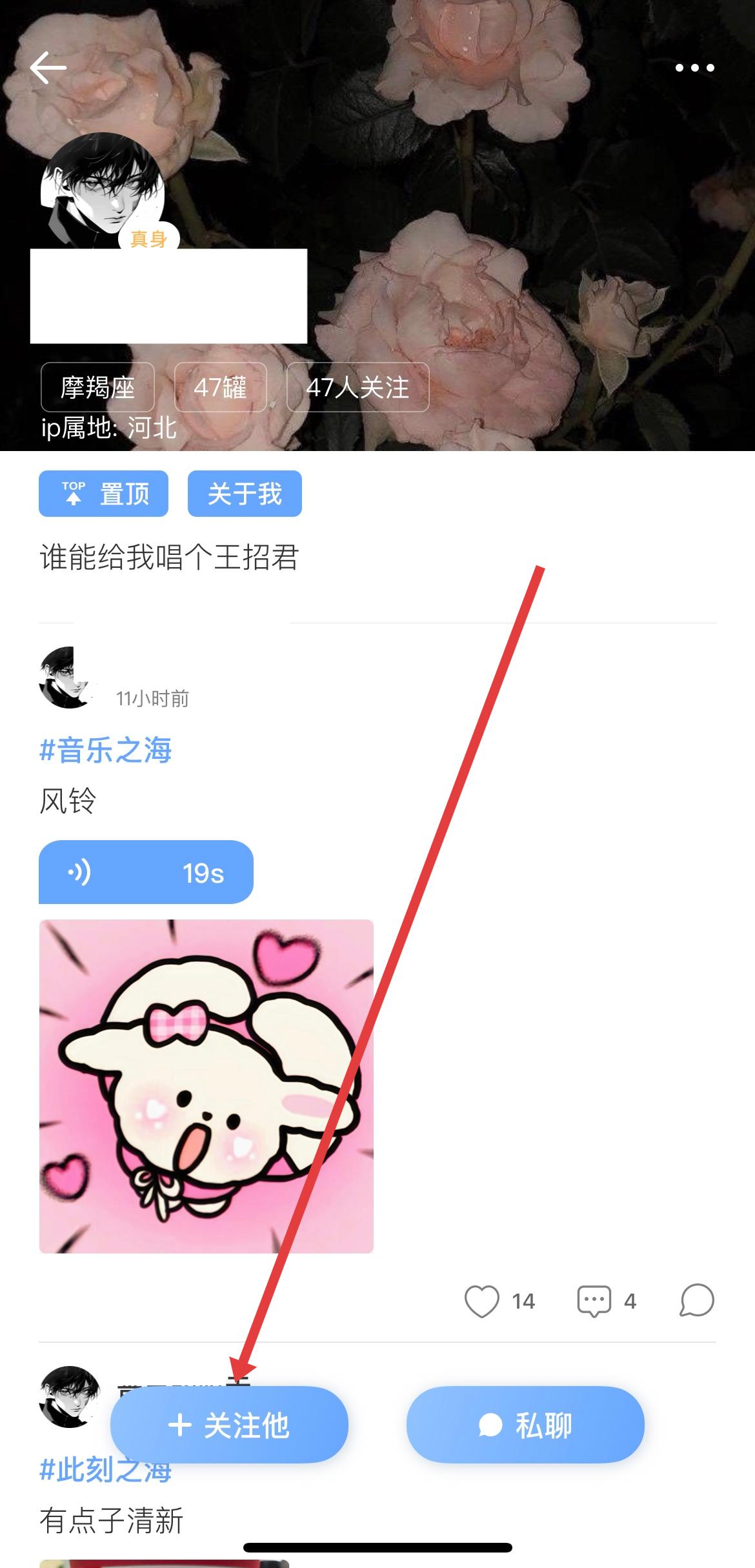 2、点击其头像或昵称,进入对方个人主页后,找到屏幕下方关注他按钮,并点击。