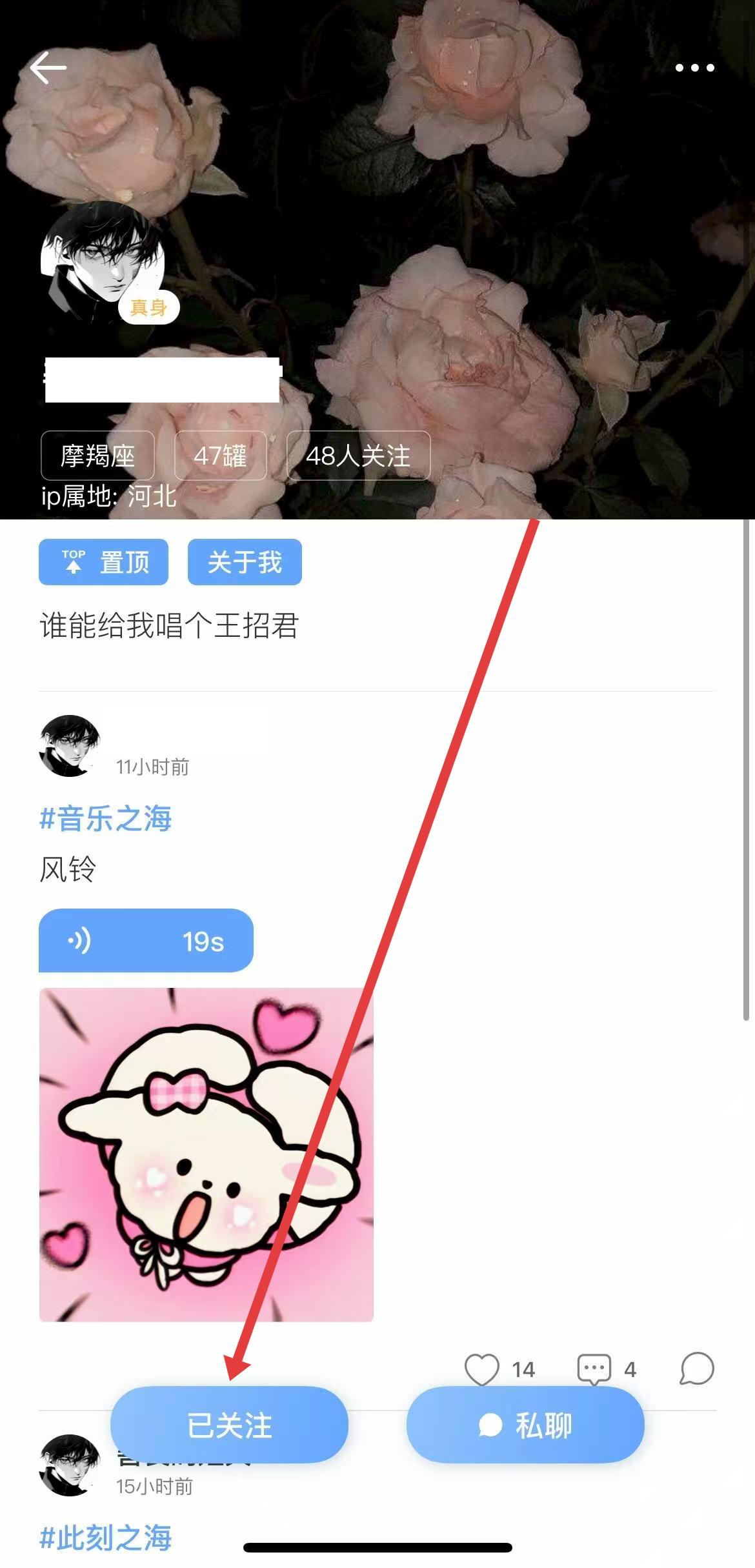 3、关注他按钮变为显示已关注,即代表成功关注了该用户,后续可在关注列表里快速找到该用户动态。