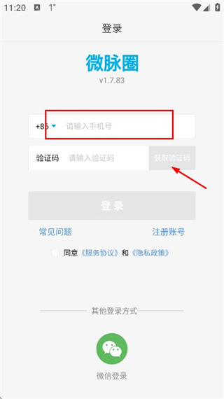 2、在登录页面填写手机号,勾选协议后,点击获取验证码。