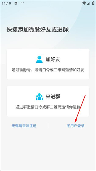 1、进入应用在快捷添加页面点击老用户登录,进入登录页面。