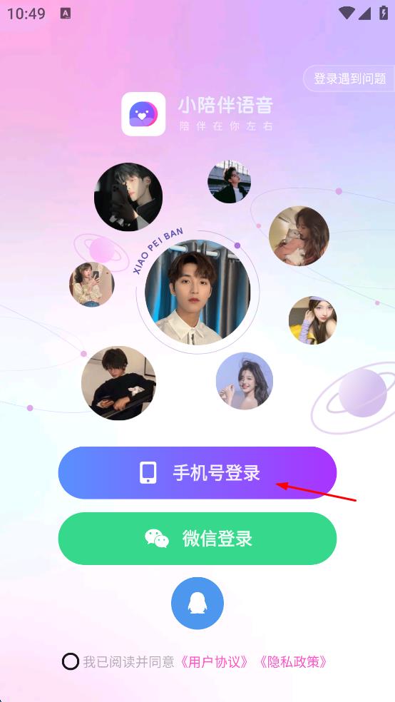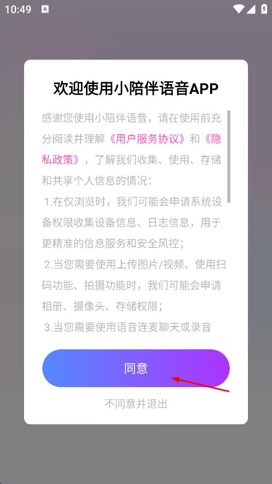 1、打开小陪伴语音,会出现用户服务协议及隐私政策界面,仔细阅读后点击“同意”,进入软件登录选择页面。