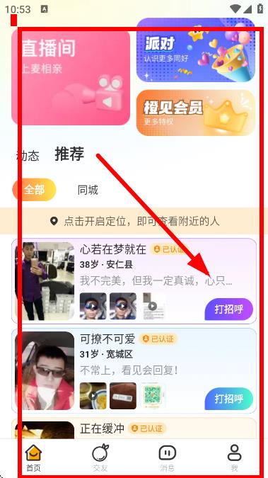 1、当我们进入首页的界面后,浏览【推荐】用户,点击打招呼的可发起互动,拓展社交关系。