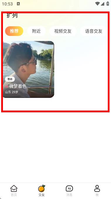 2、切换到交友页,在【扩列】板块,选推荐和附近等等标签,查看用户卡片,开启交友匹配。