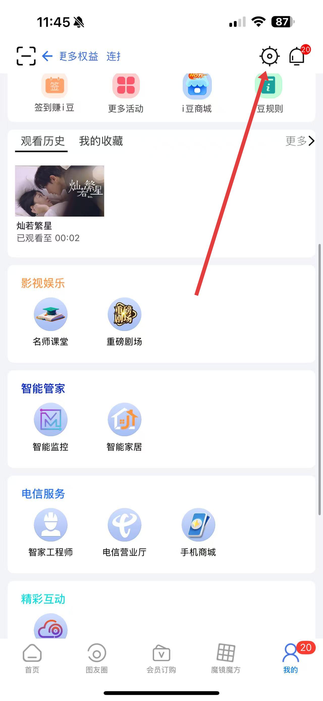 2、在个人页面中,点击右上角的设置图标齿轮形状,进入设置界面。