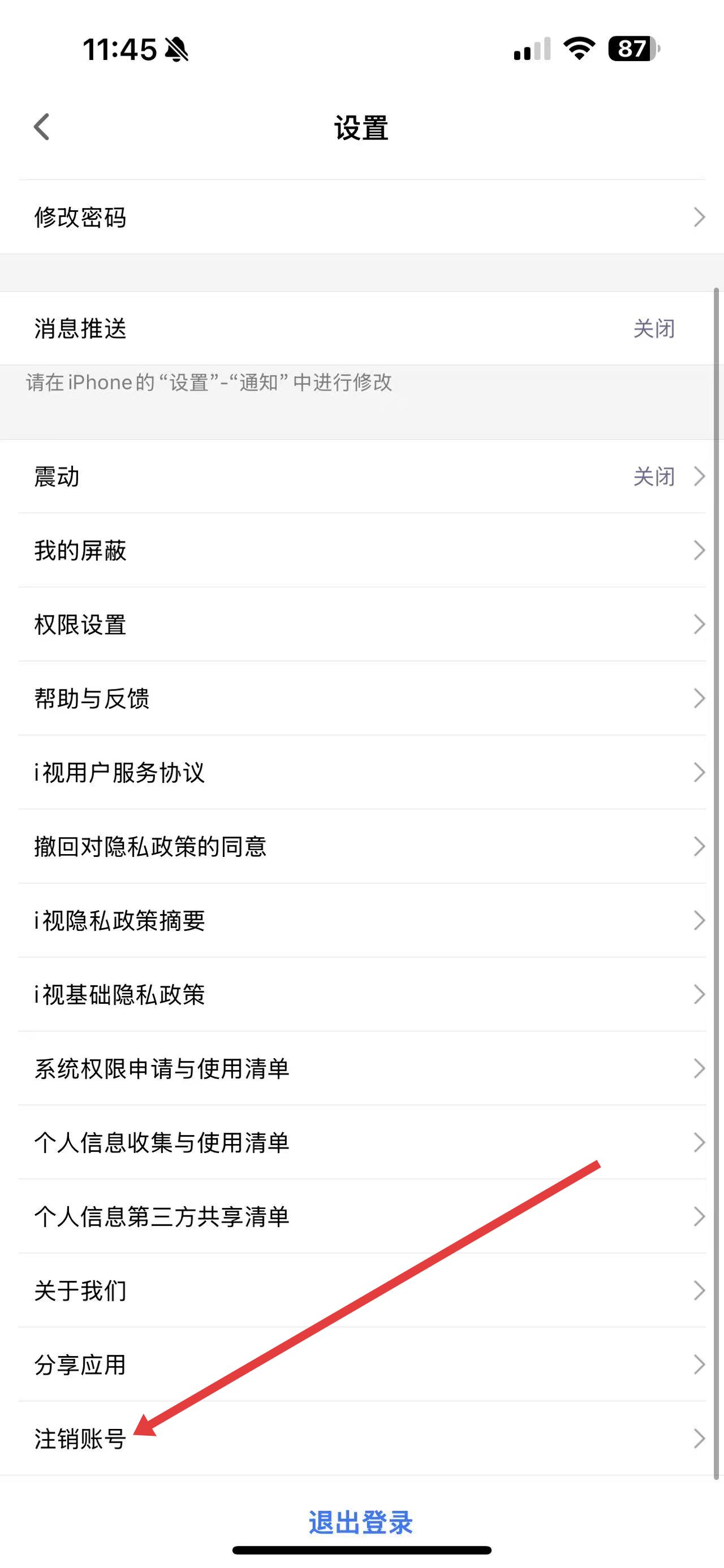 3、在设置界面中,向下滑动找到注销账号选项,点击后按照页面提示的流程操作,即可完成账号注销。