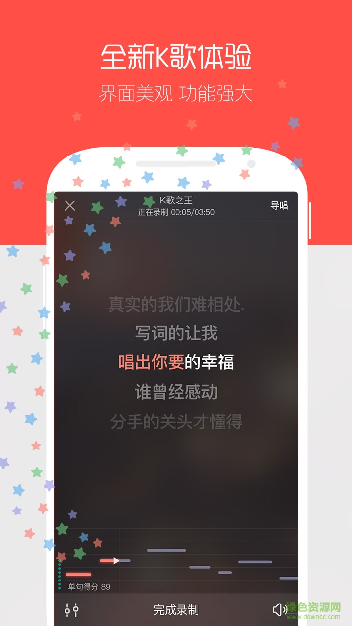 一款结合综合社交娱乐的手机K歌应用,具有智能打分、专业混音、好友擂台、趣味互动以及社交分享功能。
