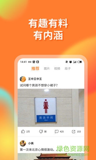 橘子搞笑app是一款能让你每日都开怀大笑的神器,这里每日都会不断的更新和发布幽默而又搞笑的段子视频和图片,让你每天都能保持好心情,还能参与评论,发表你个人的意见,如果你有搞笑的段子或视频,也可以直接分享到我们的平台,也会有其他用户为你评论点赞哦,感兴趣的朋友就请登陆绿色资源网下载使用吧!