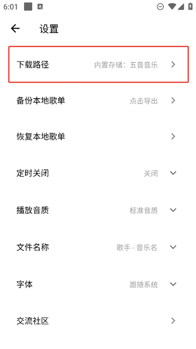 5、在设置中可以看到下载路径,将会看到现在的下载音乐位置所在位置;