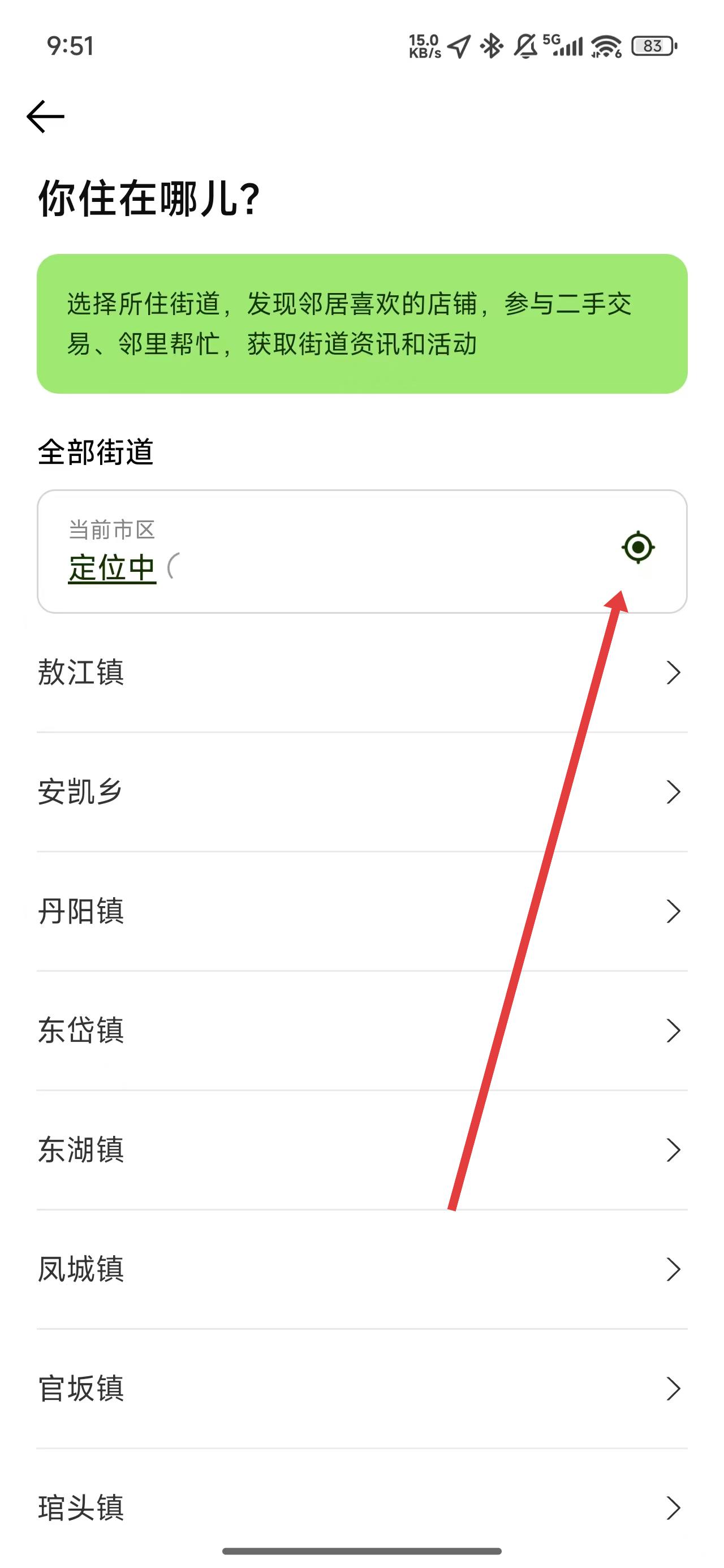 3、在定位位置页面中,可以点击箭头指向处的定位按钮,进行精准定位当前位置。