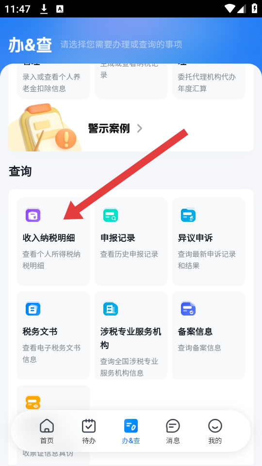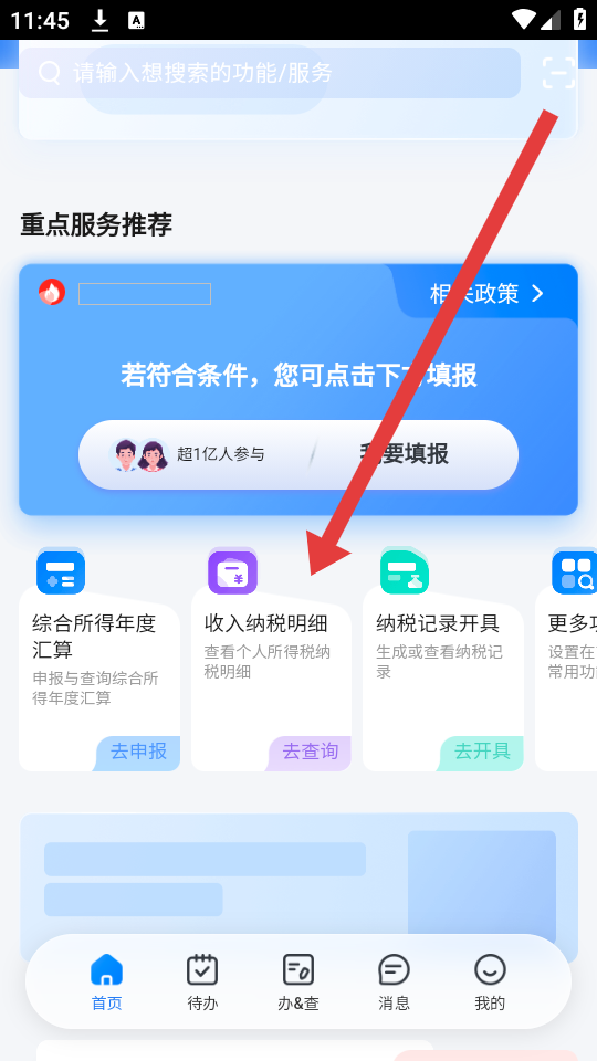 1、打开个人所得税APP的首页,需要找到收入纳税明细模块,点击进入纳税信息查询的流程。