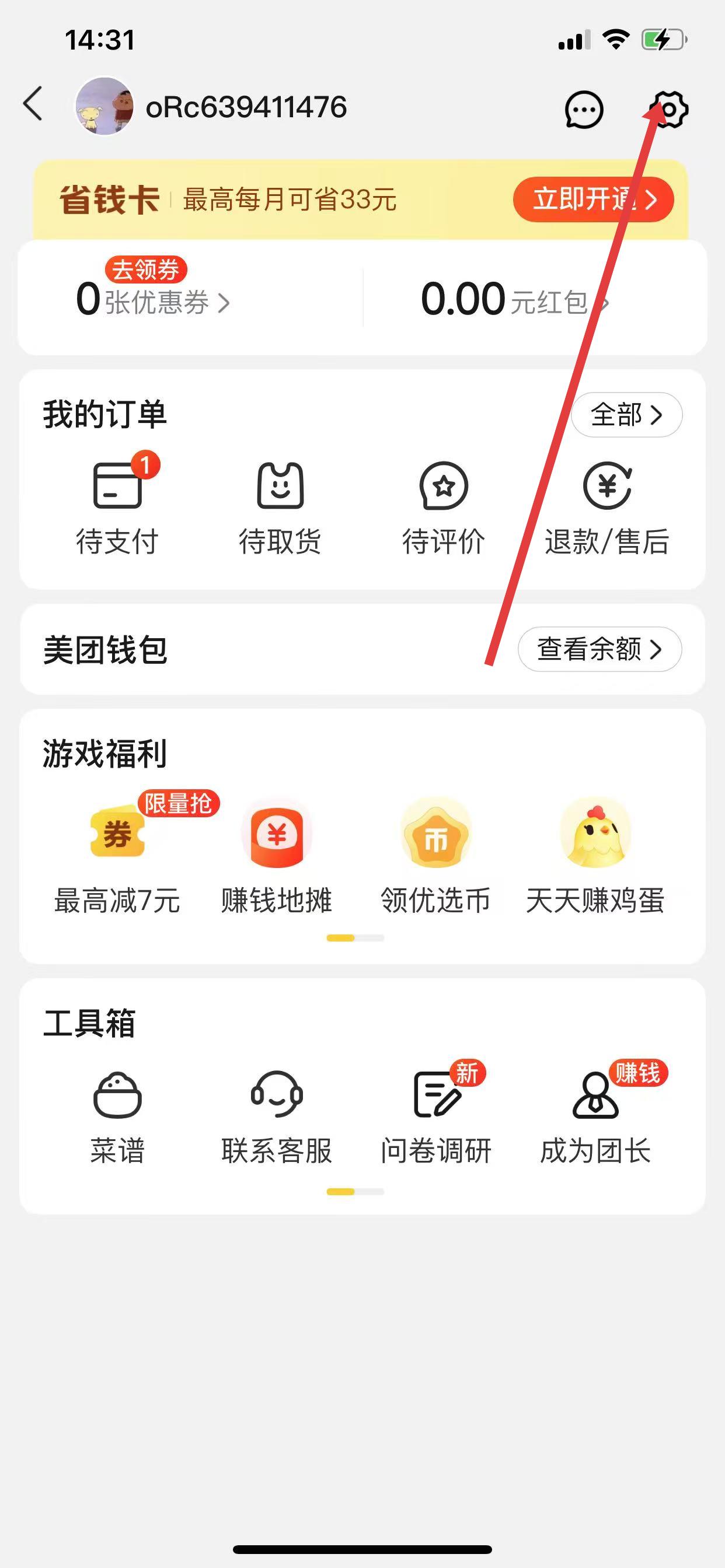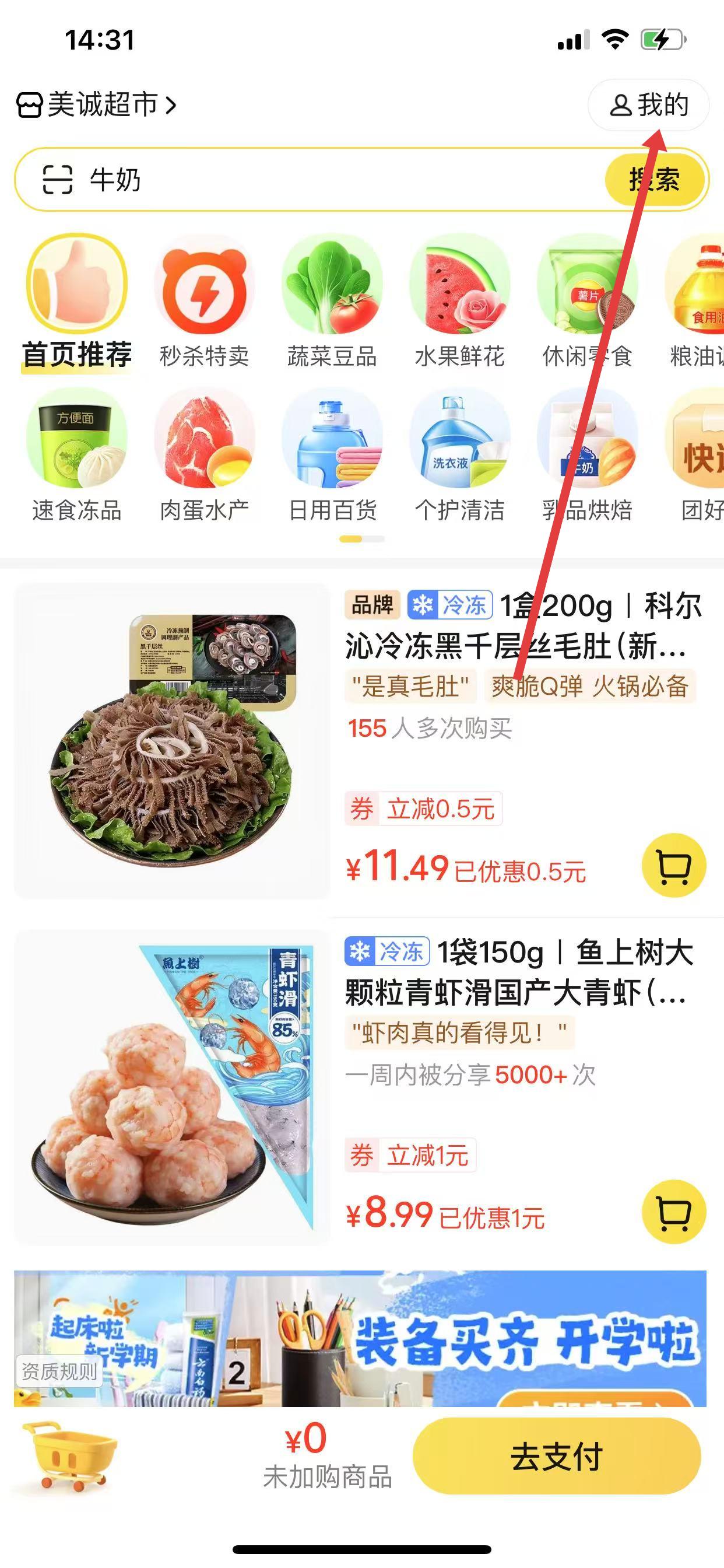 1、打开美团优选界面,点击右上角我的,进入个人页面。