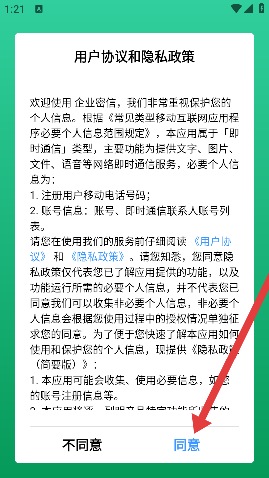 1、进入app后阅读用户协议和隐私政策内容后,点击页面底部同意按钮,确认协议并继续使用。