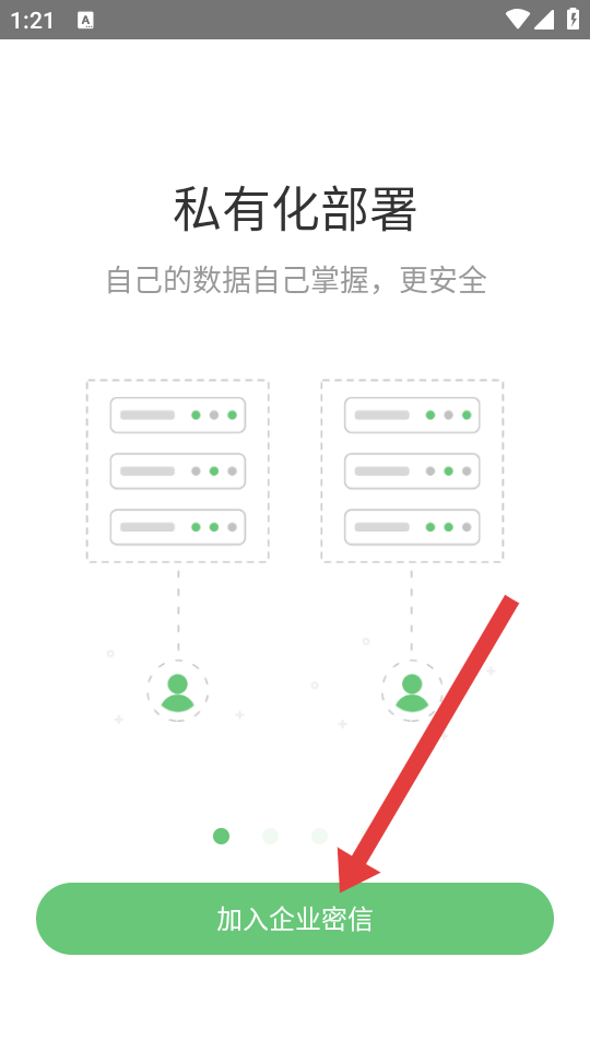 2、进入私有化部署的介绍页,可以往右滑动进行查看,点击绿色的加入企业密信按钮,进入app的服务器加入流程。