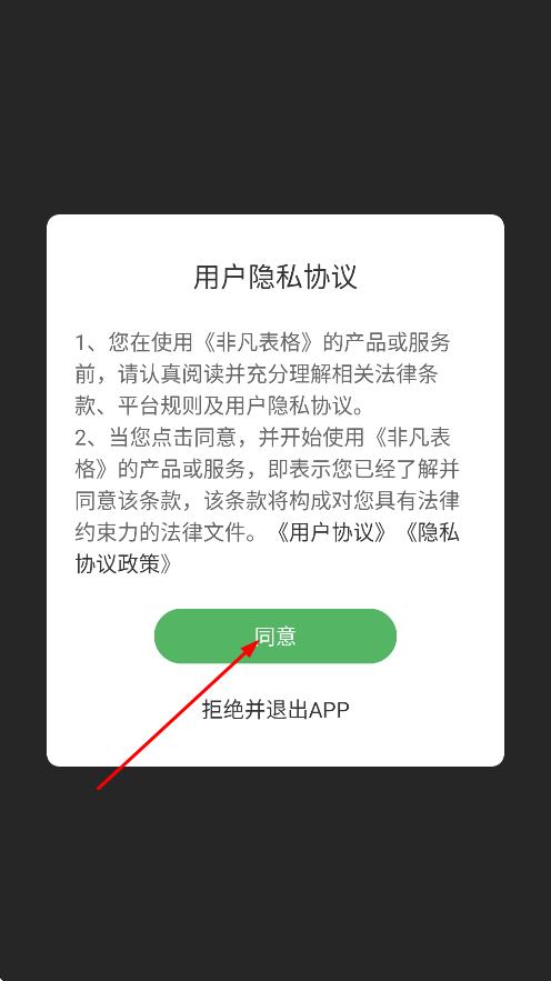 1、在用户隐私协议弹窗中,点击同意,进入非凡表格首页。