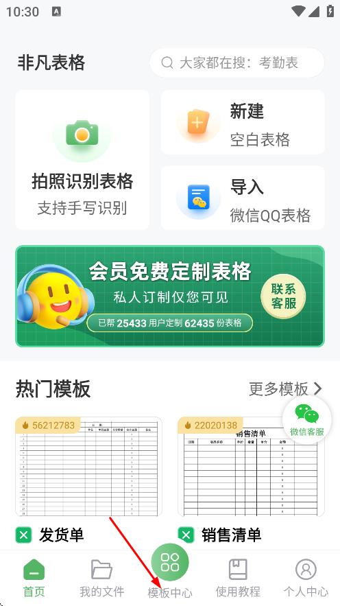 2、在非凡表格首页,点击底部的模板中心,进入模板中心页面。