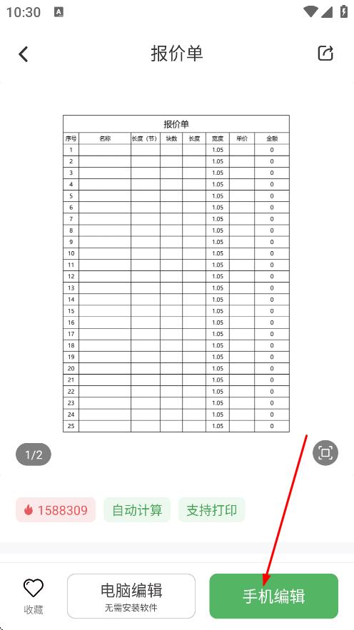 4、进入报价单模板页面后,点击手机编辑,可在手机上编辑报价单。