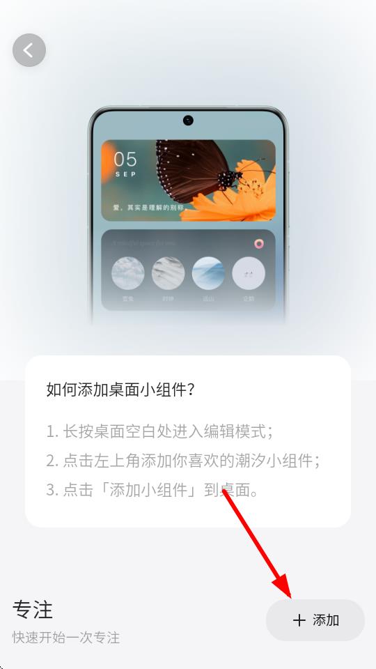 3、在小组件设置页面,比如专注板块,点击想要添加组件如番茄钟组件。