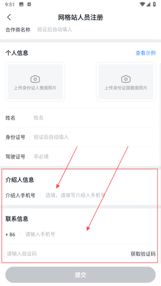 3、在介绍人信息栏选填介绍人手机号,在联系信息栏输入手机号,点击获取验证码,输入收到的验证码,所有信息填写完成后点击提交,等待审核通过即可加入美团优选物流配送。
