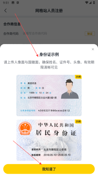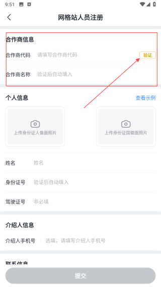 1、进入美团优选网格站人员注册页面,在合作商信息栏填写合作商代码,填写完成后点击验证按钮,验证通过后合作商名称会自动填入。