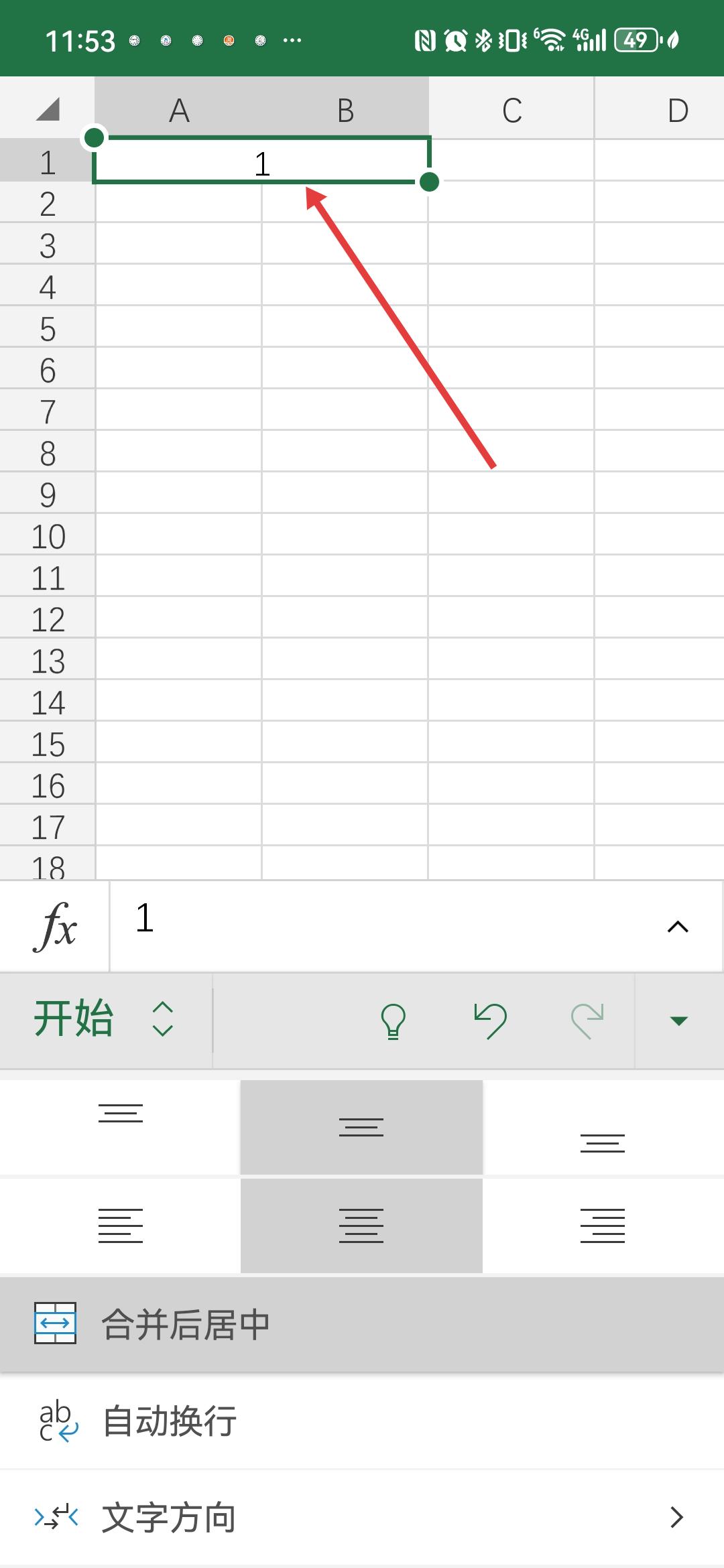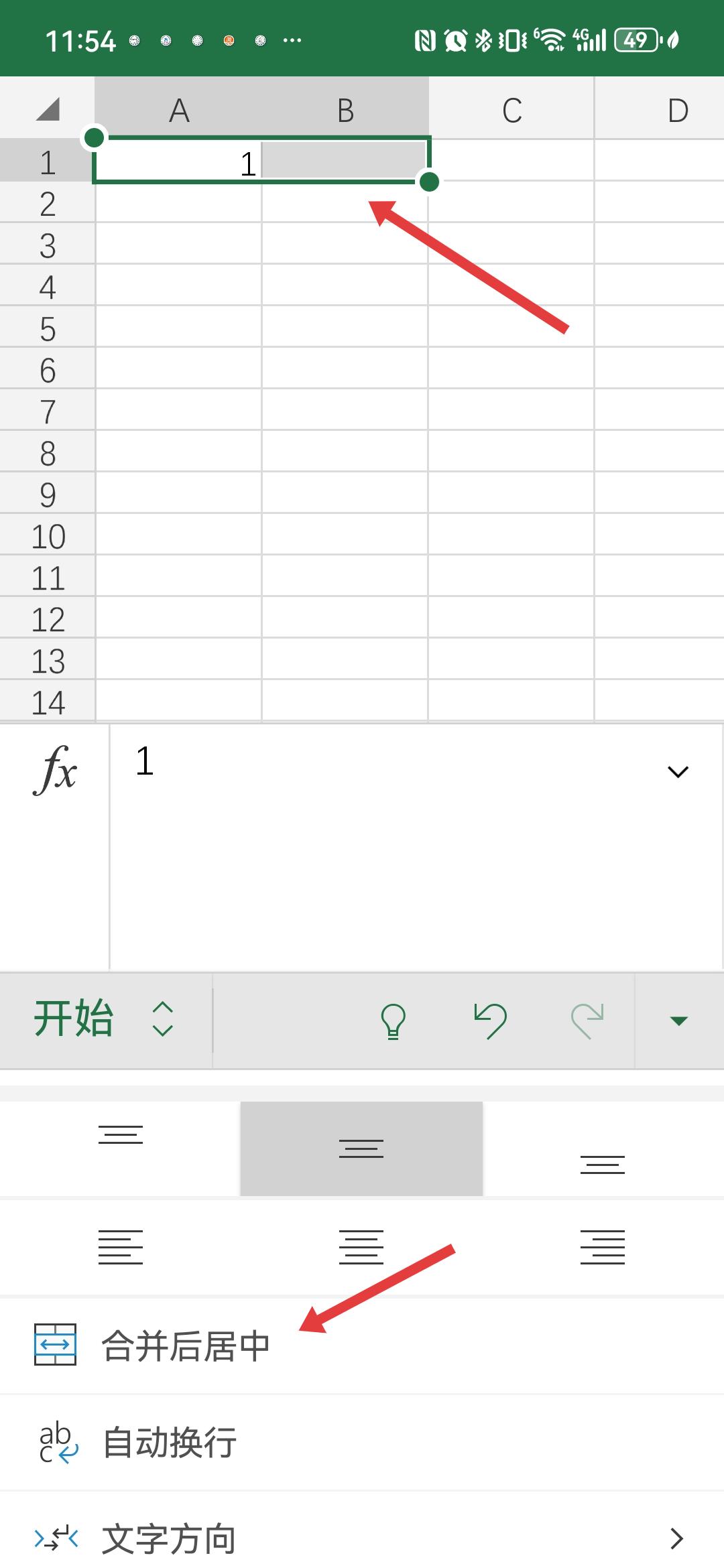 2、选中需要合并的单元格区域如A1和B1单元格,找到开始选项卡下的合并后居中按钮。