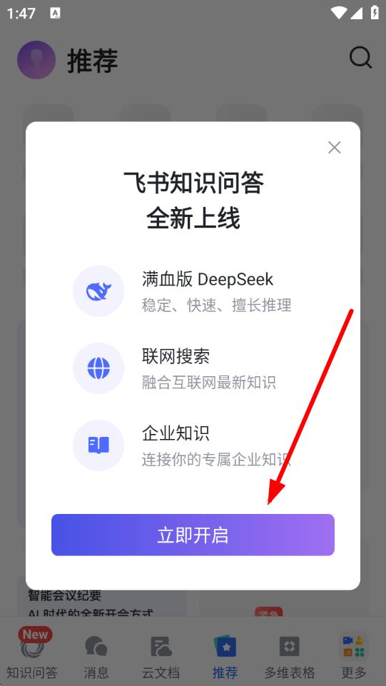 3、进入应用后,若弹出飞书知识问答全新上线弹窗,点击立即开启使用相关功能 。
