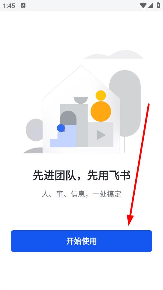 1、打开飞书看到启动页,点击开始使用进入下一步。