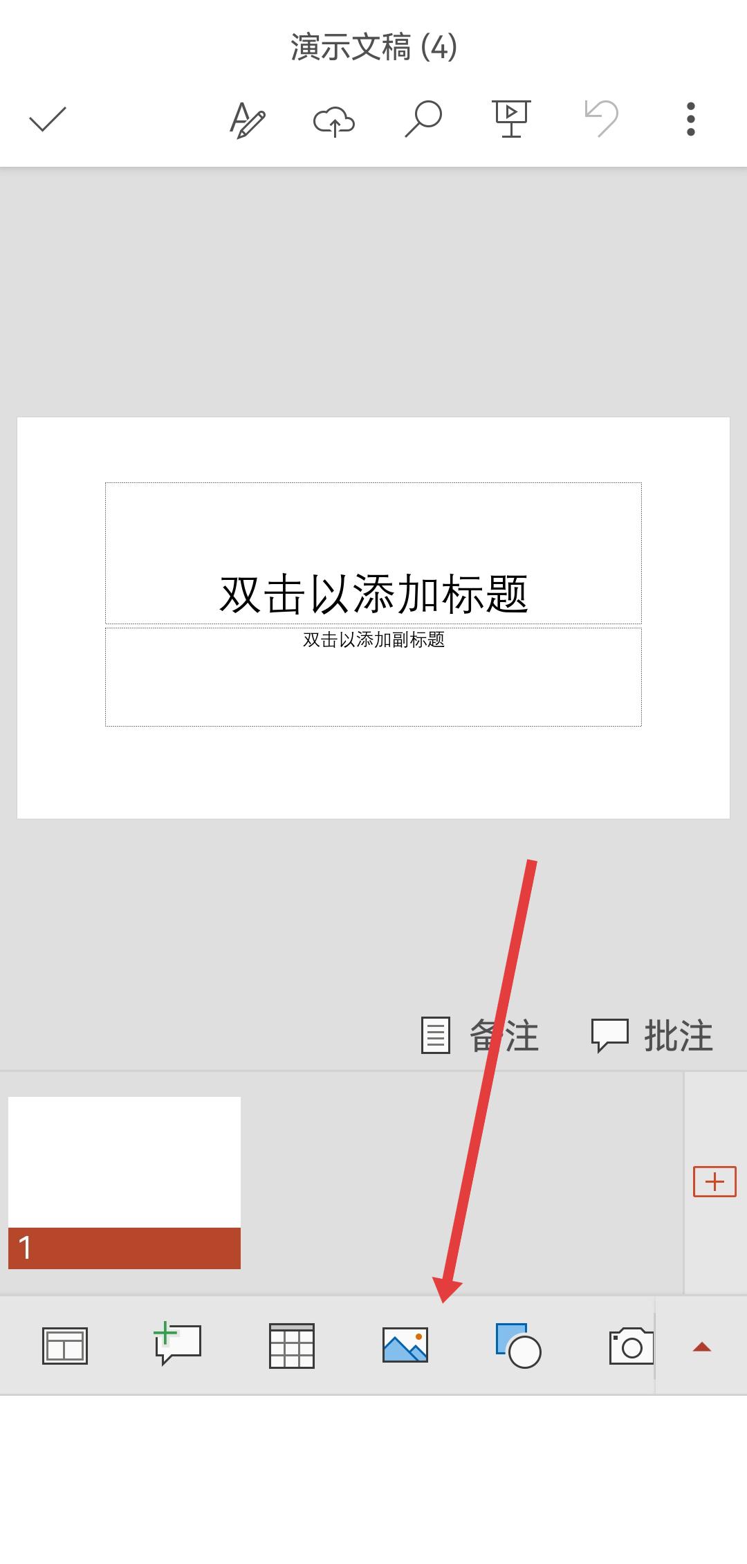 2、在幻灯片编辑的页面,点击底部工具栏的图片图标,插入需要作为背景的图片到幻灯片中。