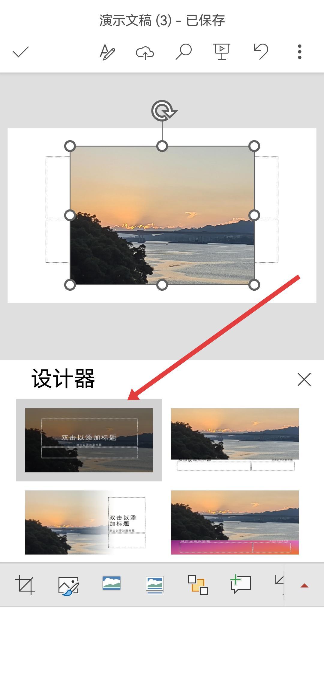 3、插入图片后,点击图片下方弹出设计器面板,选择合适的背景版式,即可快速设置幻灯片的背景。
