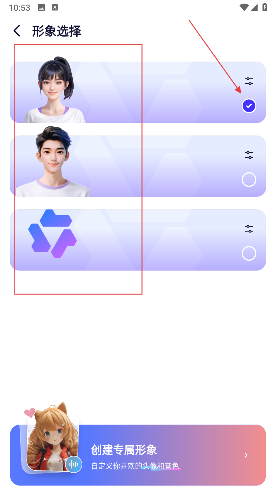 4、在形象选择页面,选择想要的形象,点击对应形象右侧的选择按钮完成自定义。