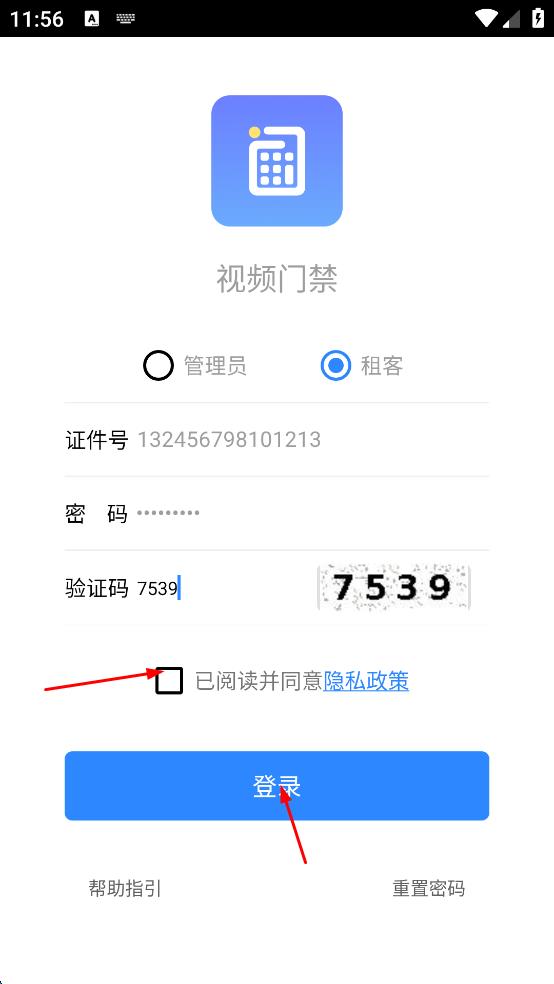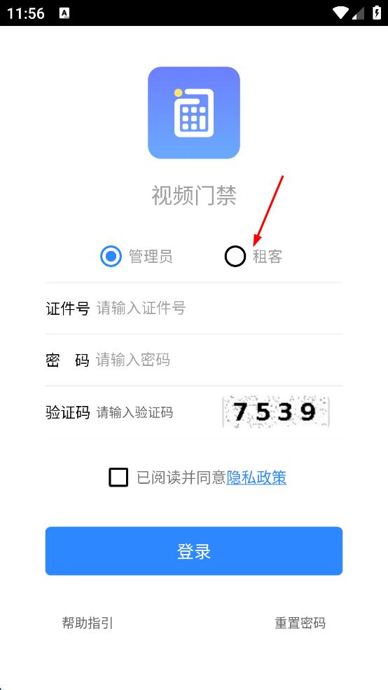 1、打开视频门禁app,进入登录界面,根据自身身份,点击“租客”选项,将登录身份切换为租客。