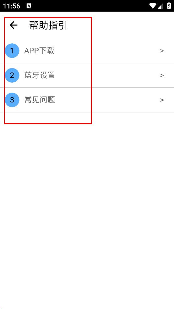 4、若在使用过程中遇到问题,可点击登录界面下方的“帮助指引”选项,进入帮助指引页面,查看“APP下载”“蓝牙设置”“常见问题”等内容,获取相关帮助。