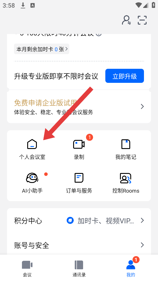 1、打开腾讯会议APP,点击底部导航栏我的,在页面中找到并进入个人会议室,查看专属会议号等基础信息。
