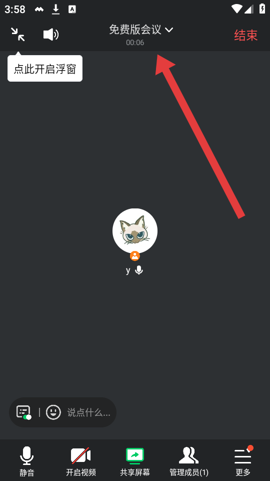 3、进入会议界面后,可以通过顶部会议等选项了解会议类型限制,还能进行静音、共享屏幕等操作,完成会议创建与管理。