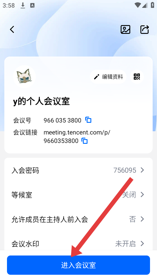 2、在个人会议室的页面,确认会议号、链接等内容后,点击下方进入会议室,快速启动当前会议。