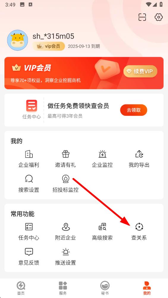 2、在个人界面的常用功能区域,找到并点击查关系选项,进入关系查询页面。