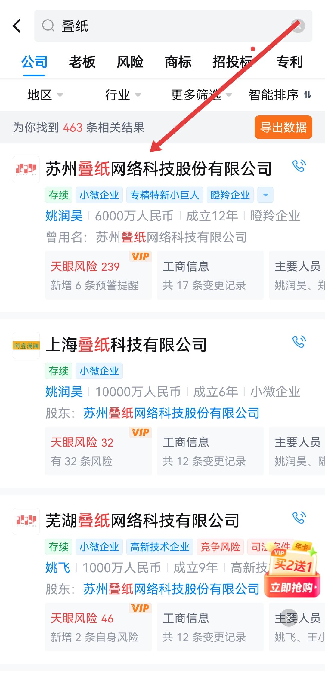 1、打开天眼查APP,在搜索框输入企业名称如叠纸,找到目标企业并点击进入企业详情页。