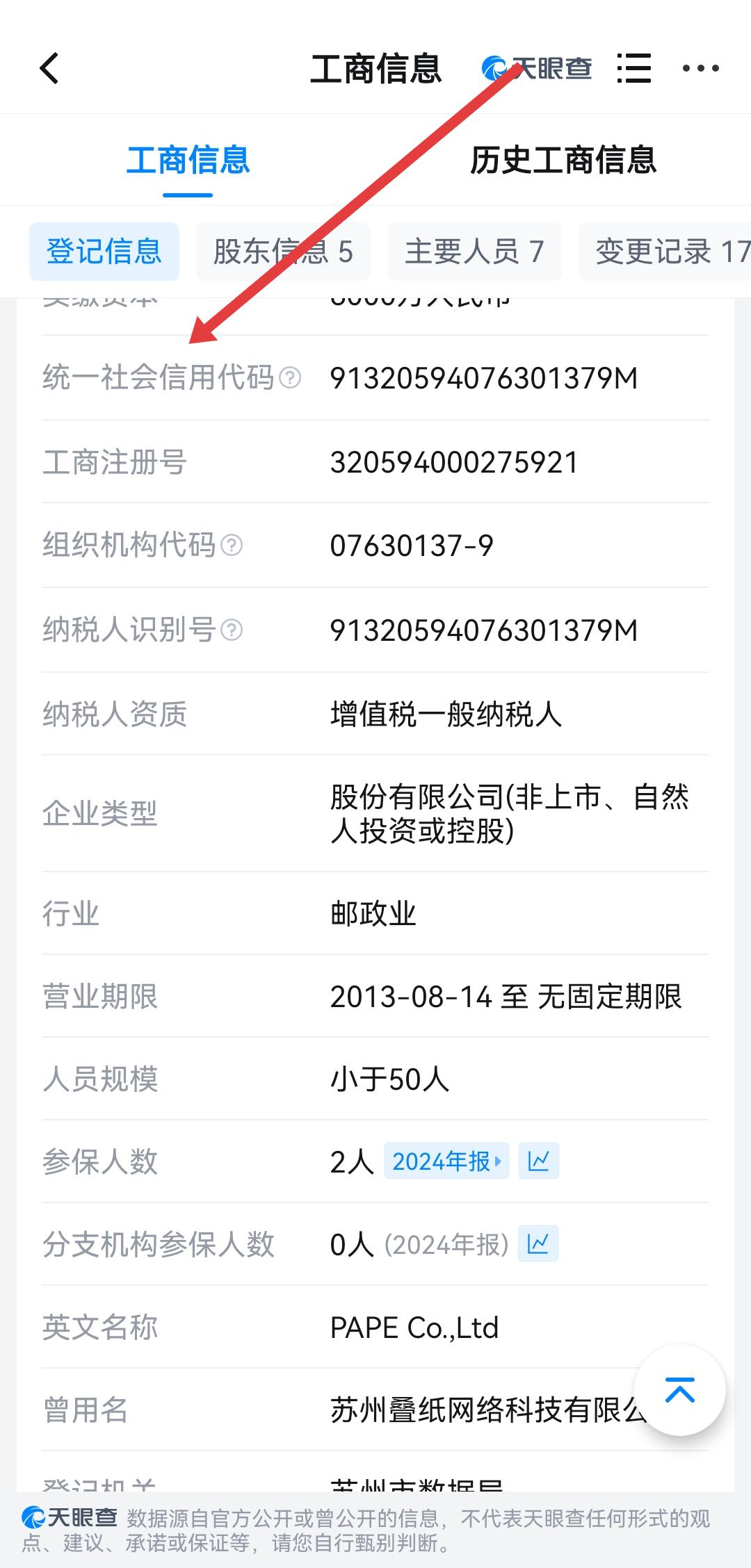 3、在工商信息页面的登记信息板块中,找到统一社会信用代码的条目,查看对应的代码内容即可。