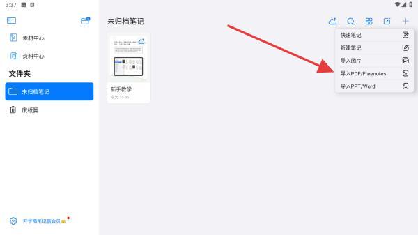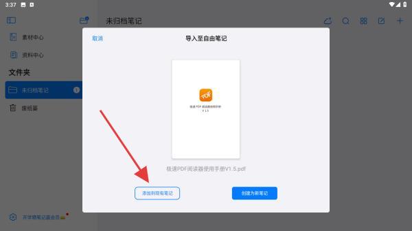 4、点击后,弹出导入至自由笔记,点击添加现有的笔记。