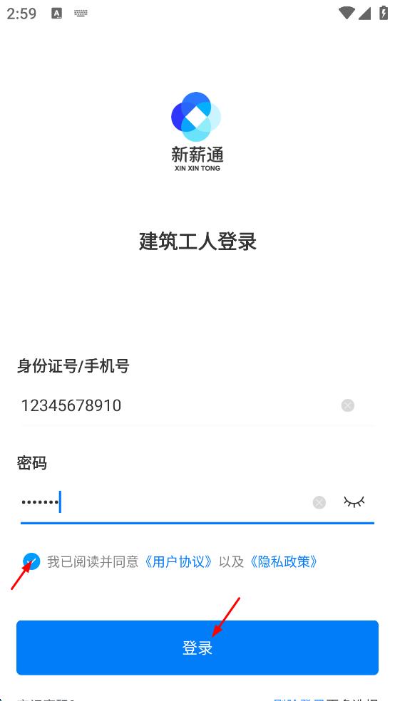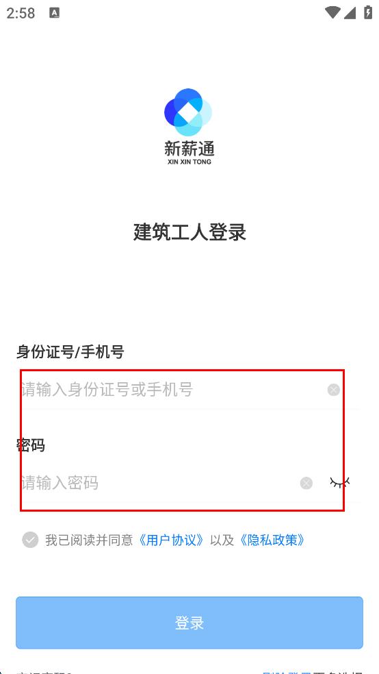 3、在建筑工人登录页面,依次输入身份证号或手机号,再输入密码。