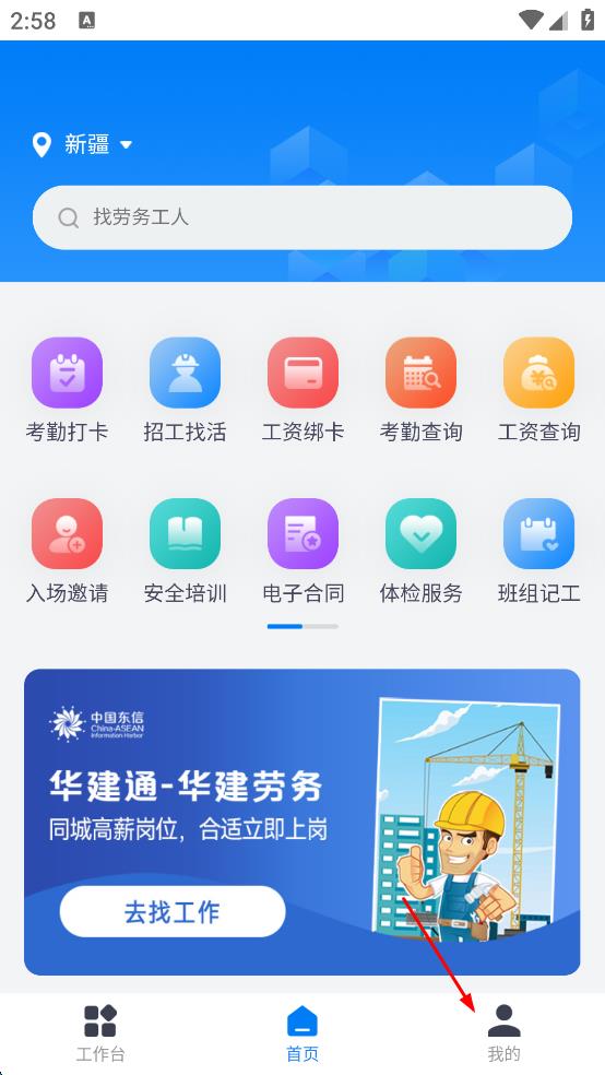 2、在首页,点击右下角“我的”,进入建筑工人登录页面。