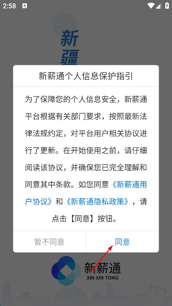 1、打开新薪通APP,在“新薪通个人信息保护指引”弹窗中,点击“同意”,进入APP首页。