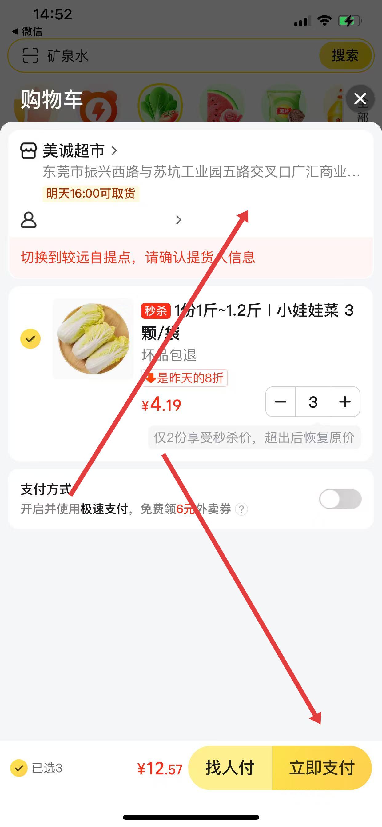 4、在购物车页面确认自提点及商品信息,选择找人付或立即支付完成下单。