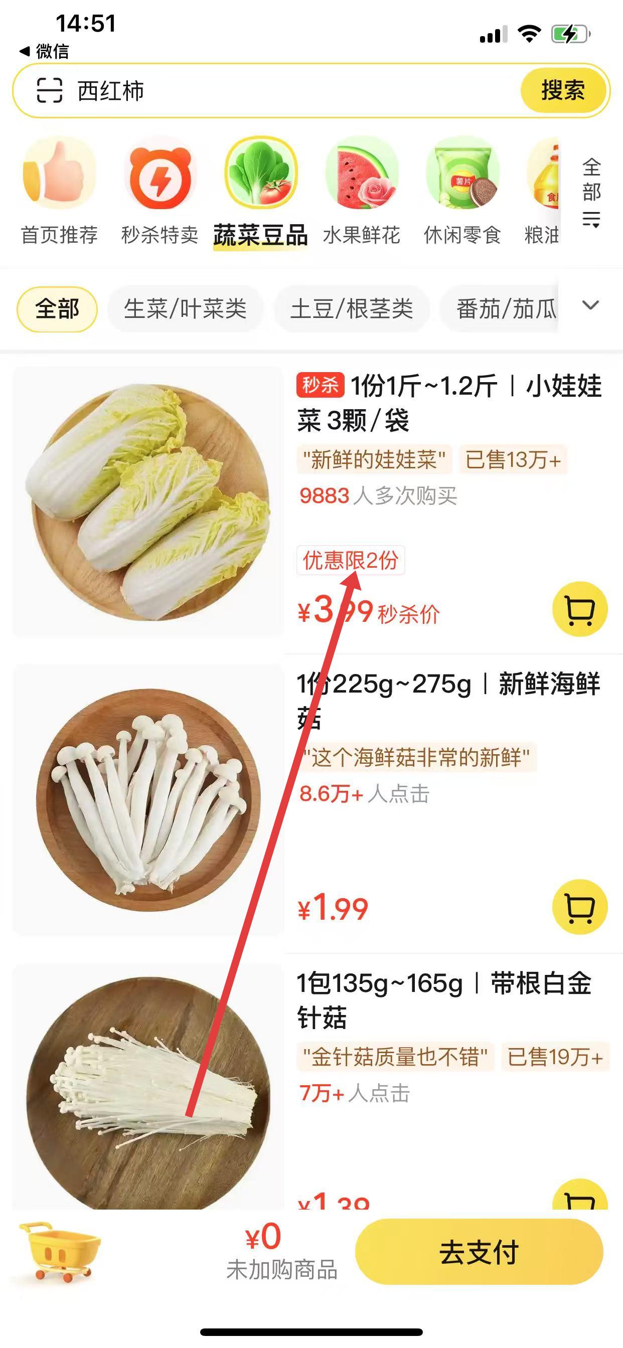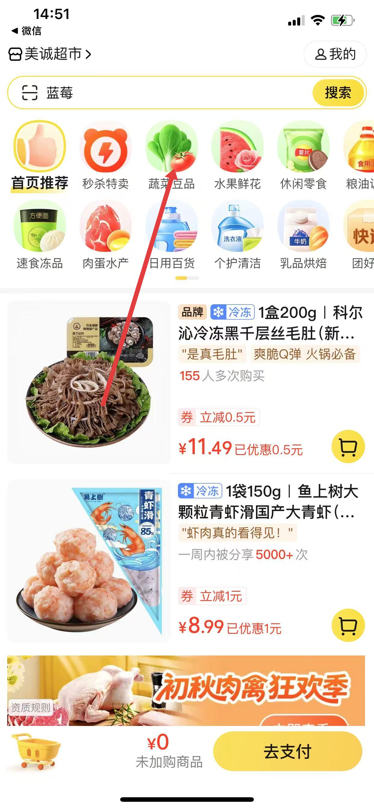 1、打开美团优选,在首页点击蔬菜豆品的分类。