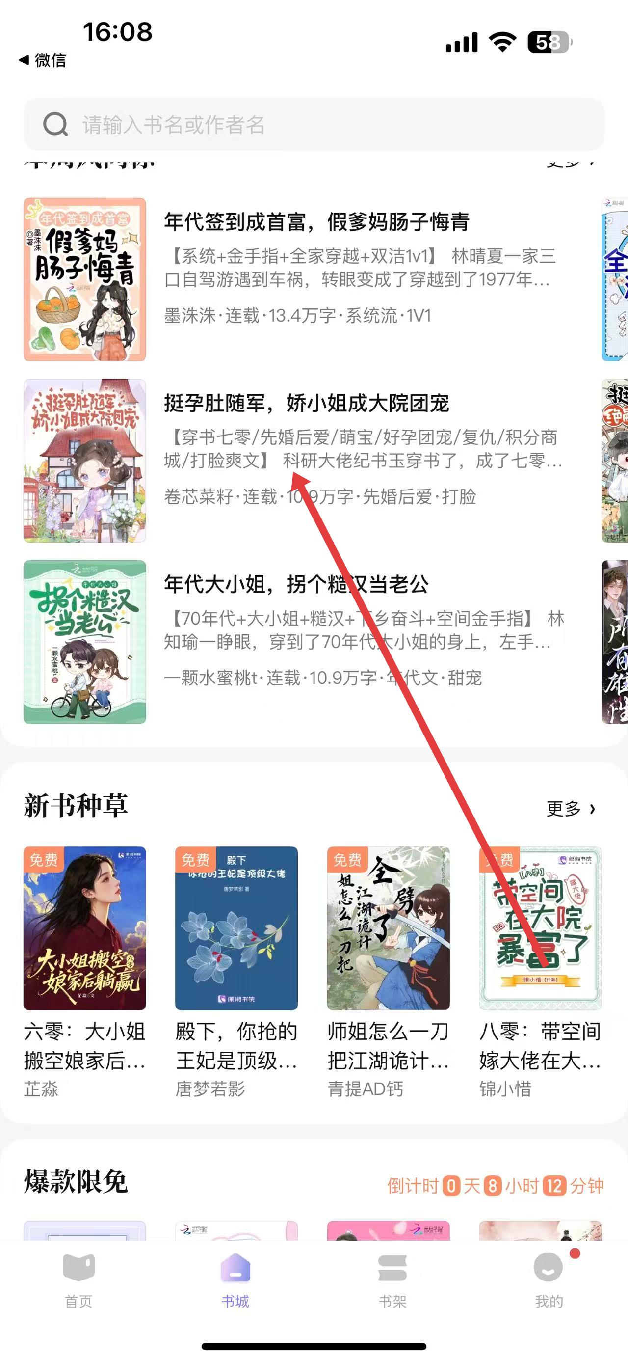 1、打开潇湘书院APP,在书城界面选中心仪小说,如挺孕肚随军,娇小姐成大院团宠,进入小说详情页。