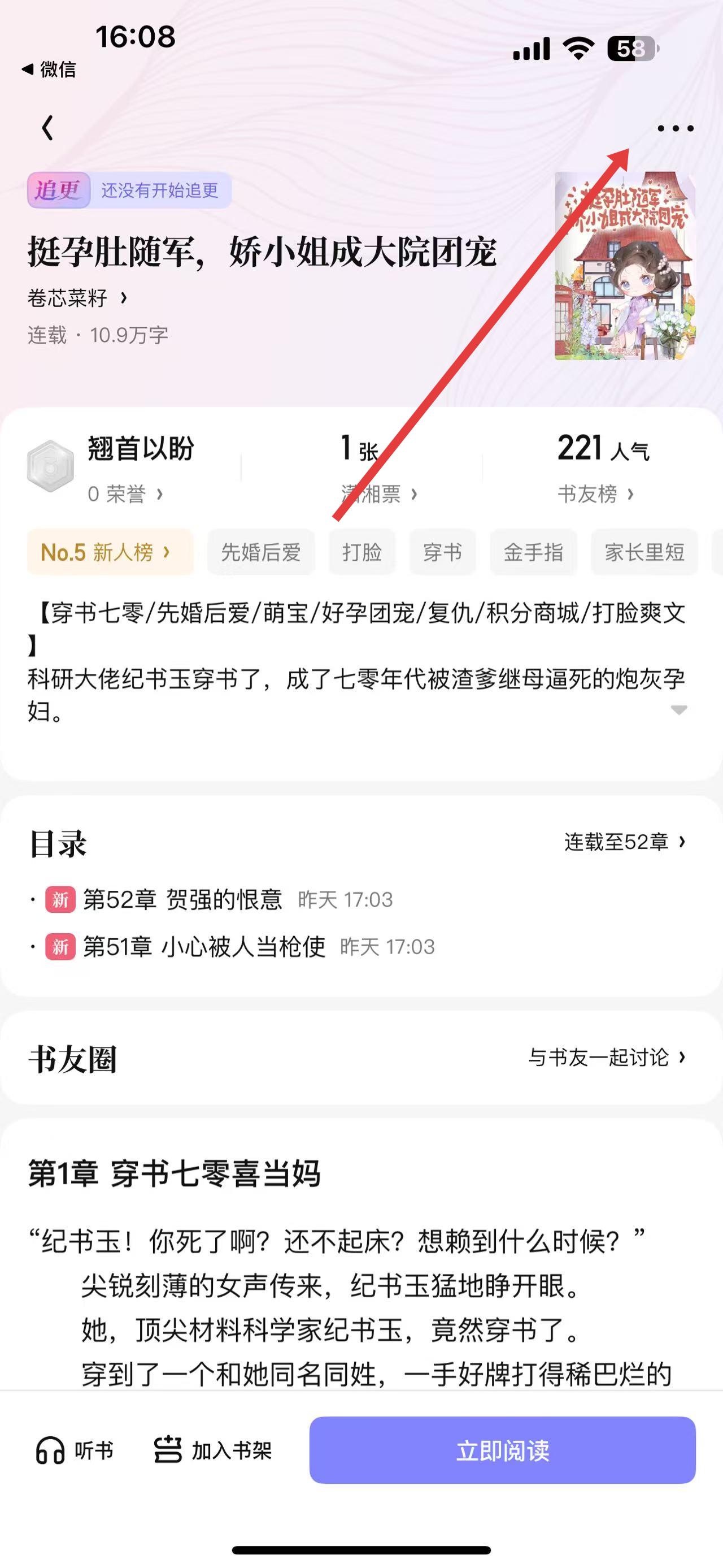 2、在小说详情页右上角,点击三点图标,调出分享等功能选项。