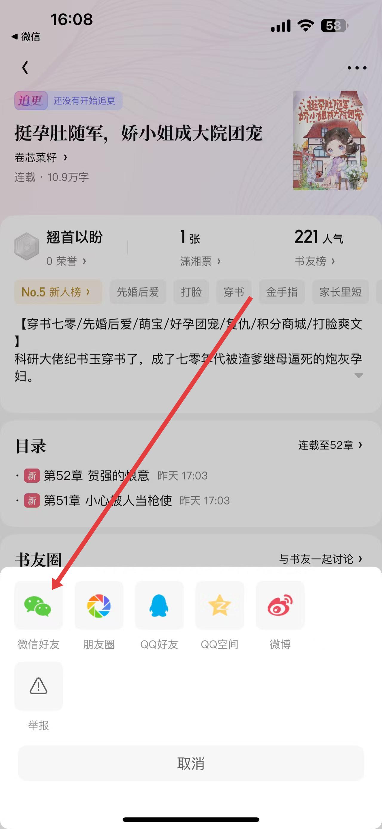 3、在弹出的分享选项里,选择微信好友,即可将该小说分享至微信。